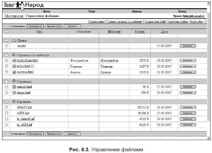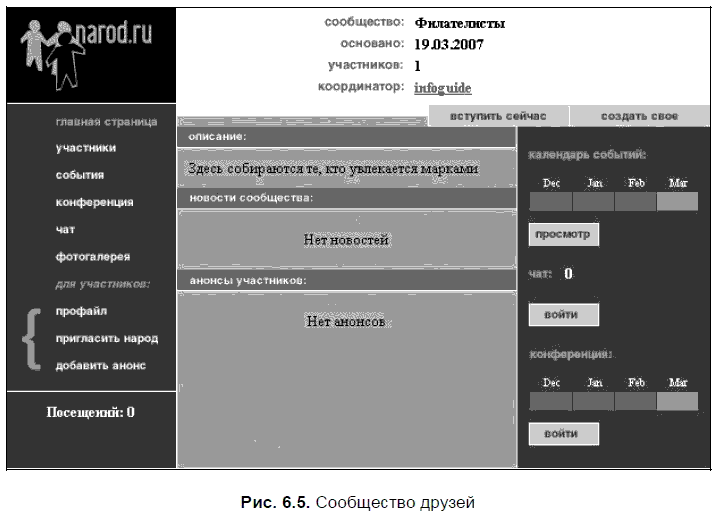 Сообщества, или клубы по интересам, — вот что еще предлагает организовать на вашем сайте Народ. Ру. Если на форуме или в чате общение ведется по самым различным направлениям, то в сообществах обычно выбирается определенная тематика, интересная для всех его членов. Здесь можно не только обмениваться мнениями, но и создавать общую фотогалерею, планировать вечеринки, совместные пикники, походы в кино и туристические поездки (рис. 6.5).