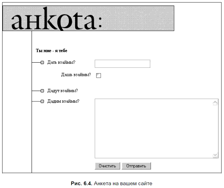 Анкета (рис. 6.4) представляет собой список вопросов, на которые требуется дать ответ. В качестве ответа может быть предложено поле для ввода небольшого текста, поле для ввода развернутого ответа, поле для высказывания согласия с утверждением (поле для "галочки"). Некоторые из вопросов могут выводиться в виде простого текста, не требующего какого-либо ответа.