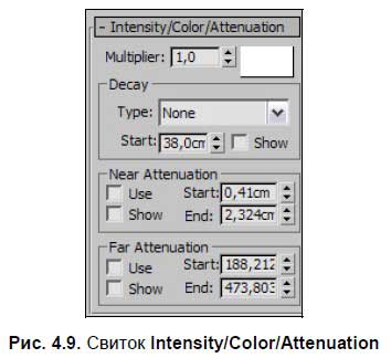 5. Вы убедились, что одним из наиболее важных параметров источника света является его позиция в пространстве по отношению к освещаемым объектам. Сейчас рассмотрим еще некоторые параметры, которые используются наиболее часто. Параметры источника света также расположены во втором разделе командной панели. Выделите созданный в сцене источник (если он не был выделен) и перейдите во второй раздел командной панели — Modify (Изменить). Здесь нам, прежде всего, понадобится свиток параметров Intensity/Color/Attenuation (Интенсивность/Цвет/Ослабление) — второй свиток. Найдите и раскройте его (рис. 4.9).