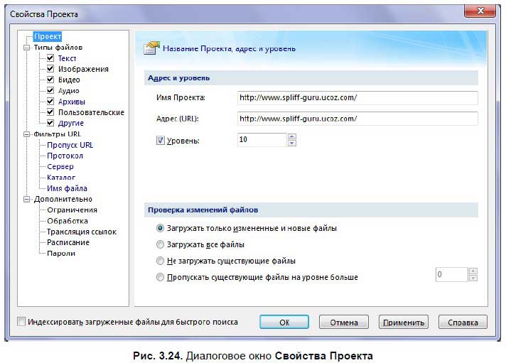 Диалоговое окно Свойства Проекта (Project Properties) содержит все затронутые мастером при создании и многие дополнительные настройки проекта. Раздел проект (Project), как видно из рис. 3.24, позволяет изменить имя, адрес и глубину загрузки проекта. Кроме того, следует обратить внимание на группу Проверка изменений файлов (File modification check): ее элементы управления могут пригодиться, когда вы повторно загружаете уже локальный проект, с целью обновить существующие и добавить новые файлы.