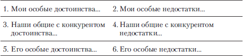 Когда вы создали подобную таблицу и честно ответили на вопросы, то дальше все сведения просто подставляются в следующую речевую конструкцию: «Да, у нас с конкурентом существуют (следующие общие достоинства). Вместе с тем у него есть (следующие особые недостатки). Тогда как мы имеем (следующие исключительные достоинства).