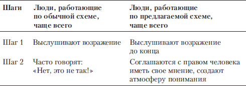 Поэтому, прежде чем перейти к пошаговому описанию общей схемы работы с возражениями «Техника извлечения корня», хотелось бы сделать маленькое отступление и сравнить чаще всего встречающуюся на практике схему обработки возражений (ту, с которой я встречалась не в книгах, а работая с реальными людьми на тренингах) и предлагаемую в данной книге.