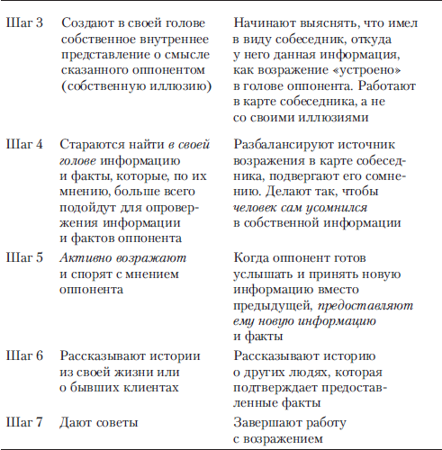 Таким образом, существует два коренных отличия предлагаемой схемы от обычной. В предлагаемой схеме мы работаем в карте реальности оппонента и с его представлениями, а не с собственными иллюзиями по поводу того, что он имел в виду. Наша задача не «забить» оппонента аргументами и доводами, а сделать так, чтобы он сам возражал на собственное возражение.