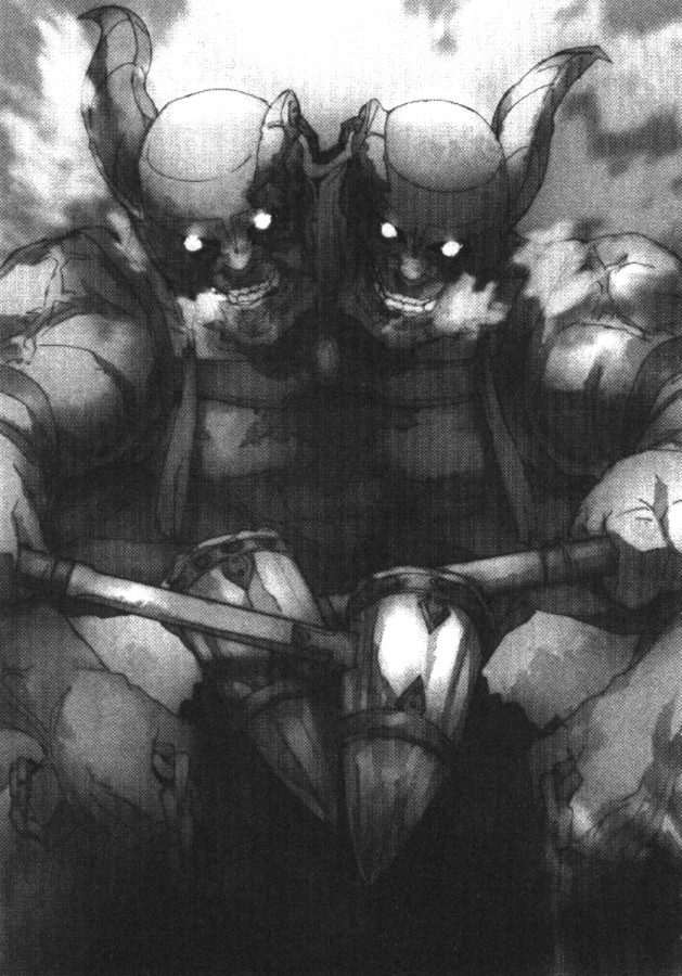 Черный великан больше четырех метров ростом. Из бугрящегося мускулами тела росли две головы и четыре руки, и каждая рука сжимала очень злобного вида дробящее оружие.