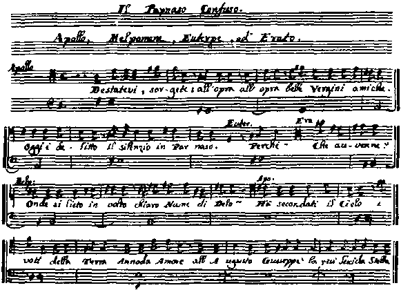 Передо мной была симфония-увертюра: две валторны, два гобоя, две скрипки, виола, чембало…Что-то очень знакомое постучалось в память. Как бывает во сне: вот-вот вспомнишь, но казалось бы, то, что стояло сейчас совсем рядом, уплывает, как облачко, из сознания все дальше, дальше. Надо отложить в сторону, бросить напрягаться, не вспоминать. Я перелистываю страницы, пока увертюра не кончилась и не показался новый титул самого действия. Перечисляются действующие лица:…Аполлон… Мельпомена… Евтерпа… Эрато… Четыре действующих лица. Речитативы — с единственной строчкой басового аккомпанемента. Потом опять оркестр и первая ария, с повторением да капо.