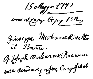 Но была еще одна интересная особенность в этом экзамене, по-новому освещающая жизнь Мысливечка в Италии. Некоторые музыковеды, пишущие о Мысливечке, именуют его эмигрантом, считают, что он «натурализовался» в Италии и сам причислял себя к итальянцам. Но вот, подавая свое прошение Принчипе, он пишет сперва по итальянски о себе, как о получившем прозвищеБогемца (detto il Boemo), что сделалось уже в Италии его обычным наименованием; а потом повторяет свое имя еще раз по-латыни, где слово «богемец» стоит уже не как прозвище (detto), а как определение себя именно чехом, богемцем: