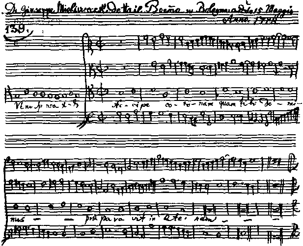 На самом деле все происходило гораздо труднее и строже. Больше того, попасть в академики удавалось очень немногим. Каждого испытуемого запирали в отдельную комнату, где он не мог ни с кем сообщаться, тема давалась обычно из старой, трудной церковной музыки, учитывалось время, за которое она была решена, и ее качество обсуждалось членами жюри тоже при закрытый дверях, до голосования. Но главное — самый допускк испытанию был делом очень серьезным, и разрешение получали только те, кто уже успел прославиться или имел большие заслуги в области музыки.Мысливечку досталась трудная тема «Приди, Господи», и его антифон тоже сохранился в архиве Болонской филармонической академии, откуда я его и воспроизвела.