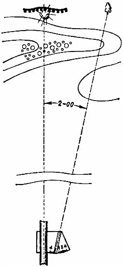 2. Цель правее точки наводки на четыре пальца; исходная установка угломера — вправо 1-20 (считая, что угловая величина пальца по ширине равна 30 тысячным).