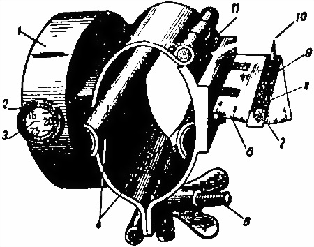 1 — обойма, 2 — откидная наметка обоймы, 3 — зажимной винт с барашком, 4 — головка, 5 — внутренняя труба стойки, 6 — зажим стойки, 7 — поперечная связь, 8 — зажим ножек, 9 — ножки, 10 — наружная труба стойки