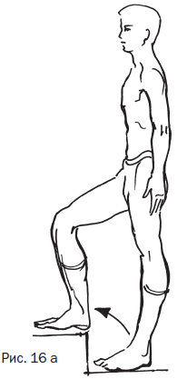 И последний тест. Самостоятельно, без велоэргометра, не выходя за пределы собственной квартиры, можно определить свой уровень здоровья — «фитнес», как говорят американцы. Сделать это можно с помощью обычной ступеньки, которая в данном случае заменит дорогостоящий велоэргометр. Это широко известный в международной практике Гарвардский степ-тест, который использовался для тестирования спортсменов до того, как изобрели велоэргометр. Техника его выполнения следующая. Нужно подобрать или смастерить ступеньку высотой 30 см для мужчин и 20 см для женщин (например, отрезать ножки у табурета). Затем производится ритмичное восхождение на ступеньку в течение 4 мин с частотой 30 подъемов и спусков за 1 мин: на счет «раз» — на ступеньку ставить правую ногу (рис 16 а), на счет «два» — левую (рис 16 б), «три» — опустить на пол правую ногу (рис 16 в), «четыре» — левую (рис 16 г).