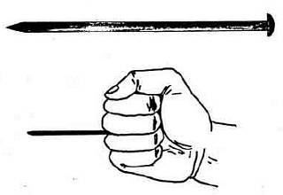 Держат гвоздь между средним и безымянным пальцами, yпирая шляпкой в ладонь. Чтобы захват гвоздя в руке был более прочным, его тупой конец дополнительно обматывают носовым платком или какой-нибудь тряпкой. Держа гвоздь таким образом, им наносят мощные колющие удары в корпус и конечности (особенно в живот, пах и ноги).