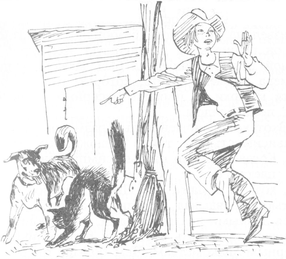 Вокруг все было знакомо и привычно. Солнечный свет мягко высвечивал крыльцо и задний двор. Там стоял родной сарай с конюшней, и оттуда доносился шум столярной мастерской. Ее основали сегодня утром юный хозяин Герцога и друзья хозяина – Сэмюел Уильямс и Герман. А совсем рядом стояли не менее знакомые Герцогу ящик для мусора, веник и щетки, прислоненные к стене. У ступеней крыльца находился люк; сквозь него наливали воду в цистерну, которая была вкопана в землю. Обычно люк прикрывался крышкой, но сейчас крышку сдвинули Пенрод и Сэм; они вымачивали в цистерне какие-то доски для своей мастерской. Словом, вокруг простирался самый мирный пейзаж. Но тем сильнее было его потрясение, когда среди родных и знакомых предметов Герцог узрел этого жуткого кота.