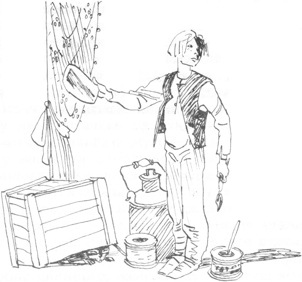 Пенрод принялся за работу. В его действиях сразу чувствовалась продуманная система. Он развесил двенадцать чулок по бортам тачки, а тачку подкатил к большому ящику. Ящик был до половины заполнен мелкими стружками для упаковки стекла или других хрупких предметов. Пенрод стал набивать стружками чулки и не успокоился до тех пор, пока они не стали походить на двенадцать колбас черного цвета. Потом он сколол чулки вместе, и они приняли подобие длинного, извивающегося тела, которое любому, кто видит, могло напомнить только змею.