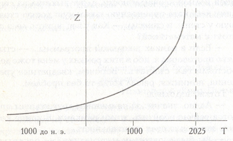 — Вот, взгляните, — сказал он. — Вдоль горизонтальной оси «Т» мы отмечаем время. С вертикальной осью «Z» дело обстоит несколько сложнее. Скажем так: это некая мера неустойчивости всего нашего сообщества. Если угодно, мера его предрасположенности к гибели. Только не спрашивайте меня, в каких единицах мы сию меру измеряем; поверьте мне на слово, что единицы такие есть, на каковую тему защищено немало диссертаций. Закрытых, разумеется. А теперь обратите внимание на эту кривую. — Он ткнул мелом в график. — В ней вся история человечества, если рассматривать ее с точки зрения безопасности всего нашего мира в целом. Можете не сомневаться, кривая построена с учетом анализа всех исторических фактов, математически абсолютно строго. Был применен весь арсенал развитой в последние годы могущественной науки — математической статистики, с использованием метода наименьших квадратов и сплайн-интерполяции. График описывается вполне приемлемым уравнением — это так называемая логарифмическая гипербола, но, если вы не возражаете, мы уж с вами не станем чрезмерно задерживаться на подобных тонкостях...