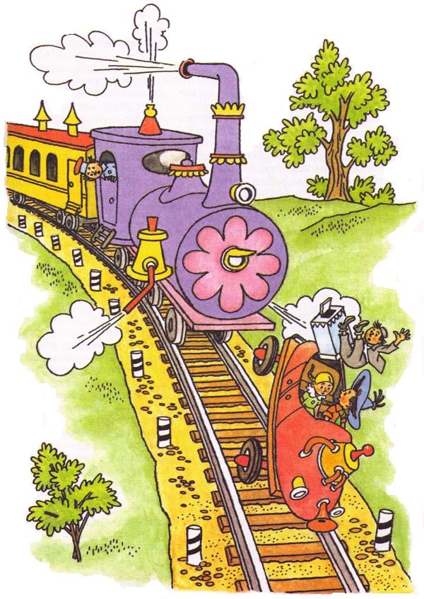 Дорога, по которой мчался автомобиль, пересекала железнодорожный путь, и Незнайка, заспорив с Пестреньким, слишком поздно сообразил, что, переезжая через рельсы, он может угодить прямо под паровоз. Он решил ехать быстрей, чтоб успеть пересечь железную дорогу раньше, чем к этому месту подойдет поезд, но чем ближе подъезжал к железнодорожной линии, тем яснее видел, что очутится на переезде одновременно с паровозом. Увидев, что паровоз совсем близко и что они несутся прямо под его колеса. Незнайка судорожно вцепился в рулевое колесо и сказал: