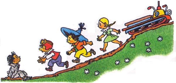 Не успел он это сказать, как свалился. Не доехав до холма, Калачик остановил машину и бросился на помощь Пестренькому. Незнайка и Кнопочка побежали за ним. Увидев, что Пестренький цел и невредим, все обрадовались, а Калачик сказал: