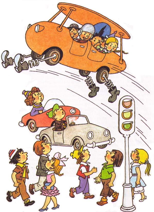 Это прыгающее приспособление имело очень простое устройство. К оси каждого из четырех колес было приделано по пружинистому железному сапогу. В выключенном состоянии эти пружинистые сапоги свободно торчали вперед каблуками на манер буферов, что способствовало амортизации, то есть смягчению удара в случае столкновения. Однако, как только прыгающее приспособление включалось, все четыре пружинистых сапога совершали вокруг оси оборот вместе с колесами. При этом сапоги упирались каблуками в землю и, продолжая вращаться, отталкивались от нее, в результате чего машину подбрасывало кверху, и она перелетала через любое препятствие, встреченное на пути. Красные светофоры на перекрестках также не являлись для машины помехой, так как она свободно перепрыгивала через поперечные улицы, пролетая над головами пешеходов и потоками автомобильного транспорта.