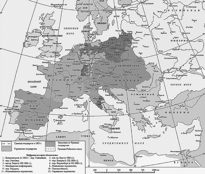 Наполеона подготовительные мероприятия союзников застали на Атлантическом побережье, в Булонском лагере, где в течение двух лет оказались сосредоточены лучшие части французских войск (свыше 160 тыс. человек), недаром этот лагерь потом назвали «прообразом Великой армии». Уже в августе 1805 г. на основе получаемой информации он сделал вывод о приготовлениях союзников и большой вероятности войны, в первую очередь с австрийцами. Это кардинально меняло ситуацию. Главные силы Наполеона были развернуты на побережье против Англии, где он готовился к исполнению дерзкого плана покорения коварного Альбиона. Против Австрии, скажем справедливости ради, в тот момент никакой концентрации французских войск не наблюдалось. В результате Наполеон вынужден был окончательно отказаться от претворения своих давних замыслов и давно лелеемой мечты – поставить Англию на колени. Да и мечта оказалась (или уже ему стало представляться) трудноосуществимой. В дальнейшем, после 1805 г., у него уже не было возможностей, ресурсов и времени замахнуться на что–то подобное. Не позволяла и отвлекала быстроменяющаяся ситуация.
