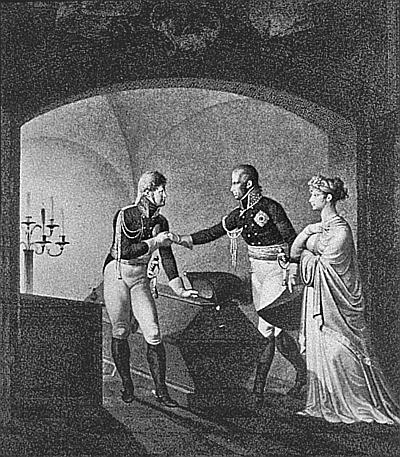 Прусский король Фридрих Вильгельм III, королева Луиза и император Александр I у гроба Фридриха II Великого. Гравюра Дж. Стикли. 1808 г.
