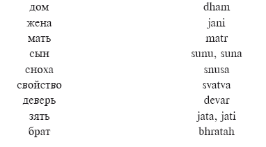 «нос» – древнеиндийское nasa, древнеперсидское nafaam, латинское nasus, литовское nosis; «зуб» – древнеиндийское dantam, авестийское dantan, латинское dens, dentis, литовское Dantis;