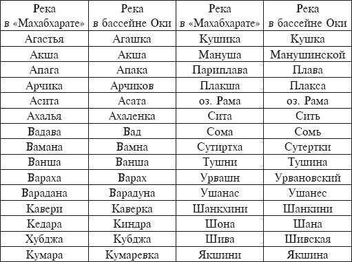 Одновременно с великими священными реками арии почитали и мелкие речки и водные потоки. Отдельный раздел «Махабхараты» посвящен хождению по более чем 200 таким священным рекам и источникам. Исследователи сравнили названия рек в «Махабхарате» с названиями рек в бассейне Оки и нашли множество удивительных совпадений. Судите сами: