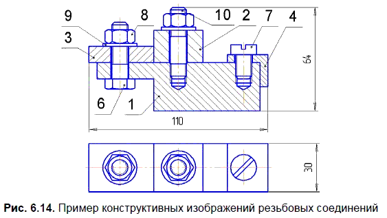 Для завершения сборочного чертежа целесообразно обратиться к конструкторской библиотеке, входящей в систему КОМПАС-3В. Структура и порядок работы с этой библиотекой раскрыта в главе 1. Для изображения гнезда с резьбой и гнезда без резьбы ниже конца винта или шпильки также могут быть использованы библиотечные элементы. При этом из набора изображений резьбовых отверстий выбирается глухое отверстие, для которого задаются такие параметры, как диаметр и длина резьбы, глубина отверстия и т. д. Следует отметить, что в конструкторской библиотеке КОМПАС на шпильках не показан сбег резьбы, поэтому конструктивное изображение шпилечного соединения требует редактирования. На рис. 6.14 показан пример конструктивных изображений болтового, винтового и шпилечного соединений.
