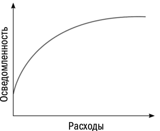 Приведенная ниже кривая показывает, что вы можете получить за свои деньги, когда речь касается маркетинга. Я часто называю ее кривой расходов и отдачи. Расходы означают инвестиции в маркетинг, а отдача означает то, что вы пытаетесь получить за счет этих инвестиций: рост объемов продаж или прибыли; достижение целей, связанных с брендом (реклама для создания осведомленности или реклама для создания должного внимания). На рисунке ниже приведена типичная кривая ответной реакции на рекламу, формирующую осведомленность о бренде.