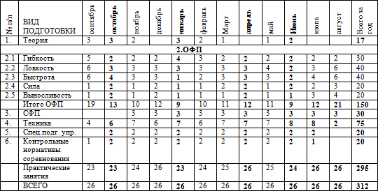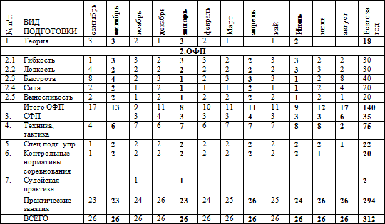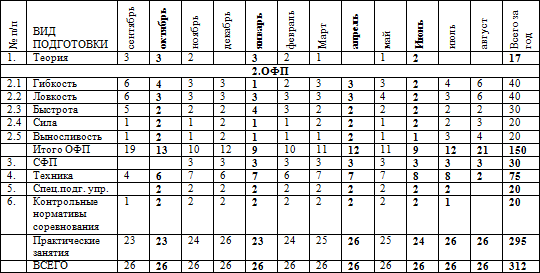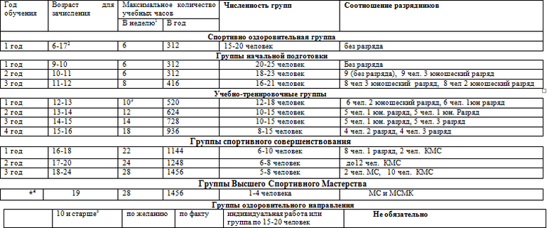 * часы в таблице указаны с учётом совмещения работы над школой базовых движений, специальной физической подготовки, совершенствованием технико-тактического мастерства и специальных подготовительных упражнений.