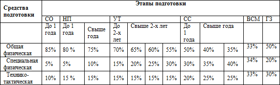 Таблица № 3 Соотношение средств физической и технико-тактической подготовки по годам обучения (%)