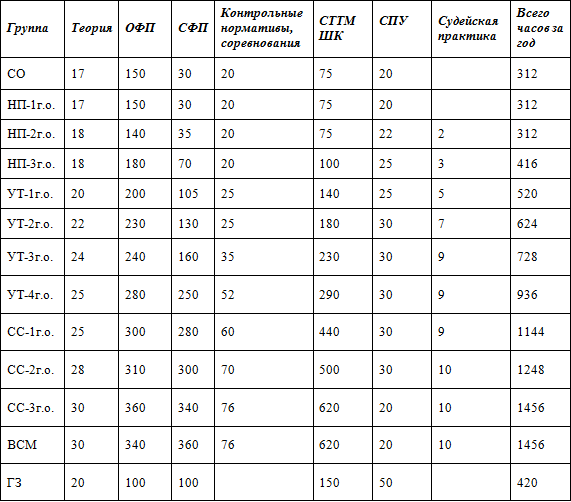 Таблица 2 Режимы учебно-тренировочной работы и требования по физической, технической и спортивной подготовке