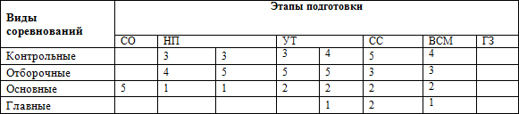 * сочетание средств подготовки в группе высшего спортивного мастерства зависит от количества соревнований и варьируется в зависимости от календарных планов федераций и текущих планов тренера-преподавателя
