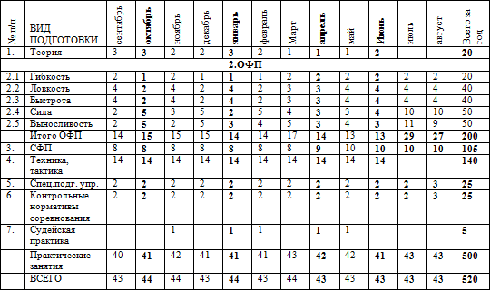 В нормативной части программы хотелось обратить внимание на примерное распределение учебных часов в планах-графиках. На первом этапе занятий детям необходимо видеть результаты своего развития. На этапе СОГ дети участвуют в ежемесячном мониторинге по общей физической подготовке. После этапа СОГ занимающие сдают контрольные нормативы по общей физической подготовке и на основании показанных результатов зачисляются в группы начальной подготовки.