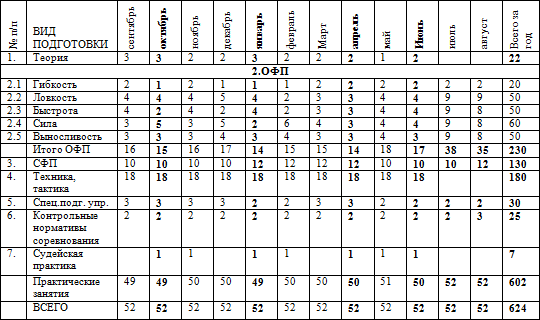 Контрольные нормативы предусматривают ежемесячный мониторинг общего физического развитияТаблица № 9 Тематический учебный план подготовки на год ГНП 3 года обучения