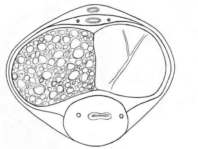 1 — поверхностная дорсальная вена полового члена; 2 — глубокая фасция полового члена; 3 — глубокая артерия полового члена; 4 — пещеристое тело полового члена; 5 — уретральная артерия; 6 — губчатое тело полового члена; 7 — губчатая часть уретры; 8 — белочная оболочка пещеристого тела; 9 — белочная оболочка губчатого тела