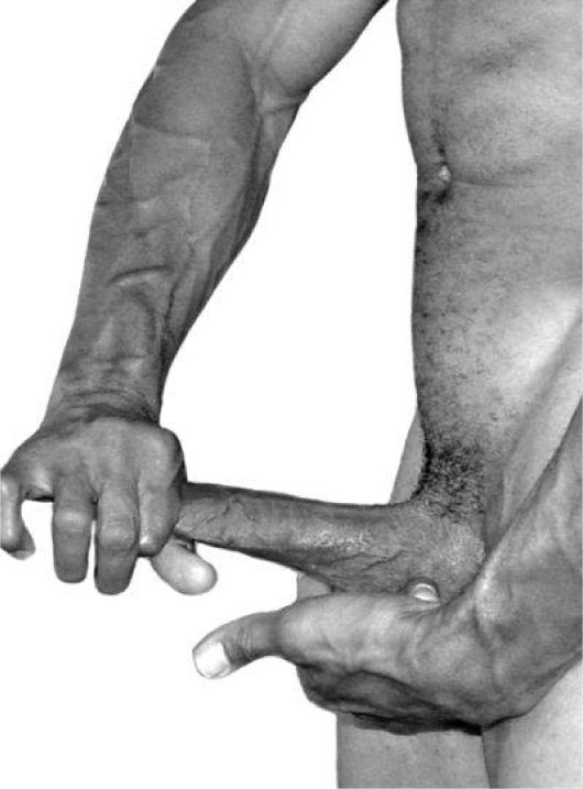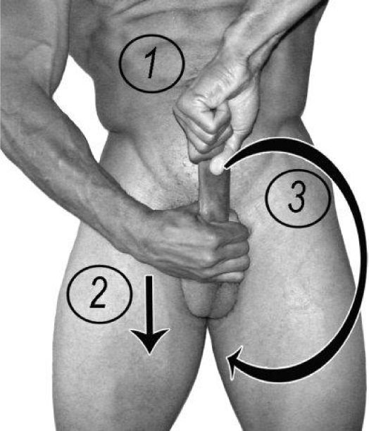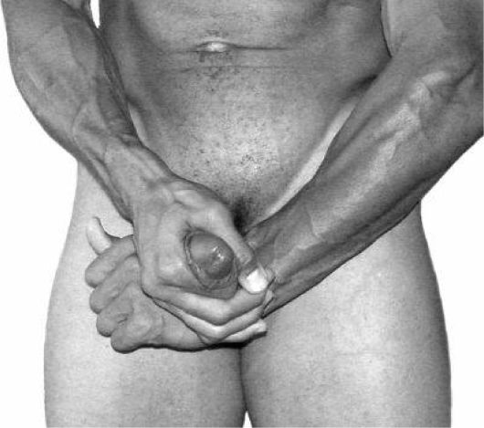 – > Одной рукой ухватите член у головки и вытяните его вперед.