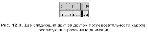Подобным образом мы можем создавать любые достаточно сложные анимации, просто добавляя во временную шкалу последовательности кадров, одну за другой. Анимированные элементы могут "гулять" по всему экрану, исчезать и снова появляться, менять цвета, отбрасывать тень, искажаться и восстанавливать свой первоначальный вид. Попробуйте поэкспериментировать — это не только позволит вам приобрести опыт, но и просто позабавит.