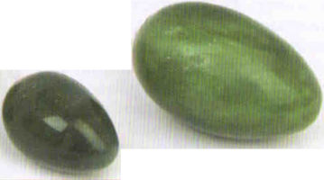 Древние китайцы так писали о цвете нефрита: «Пять цветов у него: белый, как сливки; желтый, как каштаны, сваренные в кипящей воде; черный, как вакса или лак; красный, как гребень петуха или помада губ; но самым распространенным является зеленый». Поэтому при выборе цвета камня для упражнений лучше всего довериться собственной интуиции. Возьмите камень в руку и ощутите его силу и энергию. Если вам комфортно, значит, это ваш минерал и вы успешно можете использовать его в интимных тренировках. Но опасайтесь подделок. Как и все ценные минералы, нефрит часто заменяют дешевыми поделочными камнями. В старинной книге XVI века сказано: «Смотри на огонь; если сквозь камень заметишь свет, как бы восходящее Солнце, — камень настоящий нефрит».