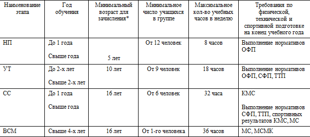* часы в таблице указаны с учётом совмещения работы над школой базовых движений, специальной физической подготовки, совершенствованием технико-тактического мастерства и специальных подготовительных упражнений.