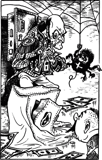 «Уу-уу!» — грозно завыли сирены по всему замку. Затопали кованые каблуки солдатских сапог. Мальчик понял, что его обманули самым бессовестным образом, что сейчас возвратится противный горбун и снова заточит его в какую-нибудь темницу. Мальчик заметался по комнате, пытаясь найти убежище, где можно было бы отсидеться, пока суматоха не уляжется. Но за каждым его шагом неотрывно следили зоркие глаза паука-предателя.