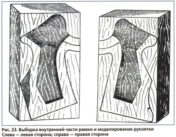 На внутренней плоскости правой щечки вычертить карандашом форму рукоятки, исходя при этом из размера кисти руки. Намеченный рельеф правой стороны рукоятки вырезать узкой лучковой пилой. Затем соединить обе щечки и по правой счертить левую.