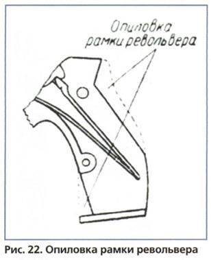 В связи с этим рукоятка в местах подрезки трескается, откалываются верхние опорные выступы щечек, и она приходит в негодность. С целью усиления прочности рукоятки необходимо опилить заднюю часть рамки револьвера (рис. 22).