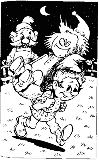 Петрушка помог судье почистить костюм и приклеил смолой оторвавшиеся волосы. И когда судья немного отдохнул, они пошли по тропинке, извивающейся по лугу.