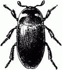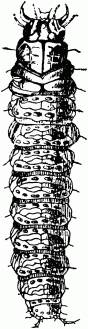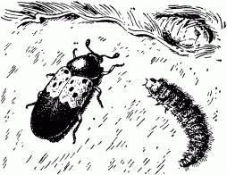 Всю весну и большую часть лета кормятся в моих мисках жуки и личинки фришевского кожееда. Личинок этих нельзя назвать красивыми, наоборот, это безобразные существа в жестких темных волосках. Спина у них горохового цвета с рыжей полосой вдоль середины, нижняя сторона туловища беловатая. На конце брюшка, сверху, два согнутых шипа, отталкиваясь которыми личинки проворно передвигаются во всяких щелях.