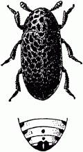Кожеед ветчинный, его личинка и куколка (x 3).