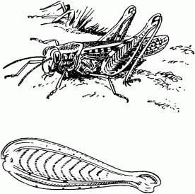 Кобылка повернулась головой вверх, и, конечно, обвисшие крылья и надкрылья заняли свое естественное положение: до этого крылья висели над надкрыльями. Вполне развитые крылья саранчовых складываются веером. На них ряд продольных жилок, служащих основой крыла, а между ними множество мелких поперечных жилок, образующих густую ячеистую сеть. Надкрылья гораздо уже крыльев, они толще и грубее, но с такой же сетью жилок. Вначале, пока крылья еще недоразвиты, сети жилок не видно, заметны лишь морщины, изогнутые бороздки и складки.