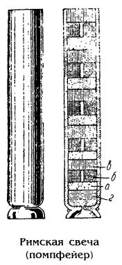 Римская свеча, или помпфейер, состоит из длинной прочной бумажной или металлической гильзы, наполненной последовательно в несколько рядов порохом а, звездками б и промежуточным медленно горящим составом в. Один конец гильзы на высоту 25–30 мм забивается сухой глиной г, образуя дно гильзы. При горении свечи происходит ряд выстрелов с выбрасыванием на значительную высоту цветных звездок. При соблюдении правил снаряжения по подбору зарядов пороха и цвета звездок, римская свеча является одной из эффектнейших (помпфейер) пиротехнических фигур. В фейерверках применяется как самостоятельная фигура. Сжигается в одиночку и группами.
