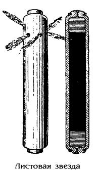 Листовая звезда представляет собой прочную гильзу, плотно набитую медленно горящим составом, дающим белое или цветное пламя. Близ одного конца гильзы по всей окружности просверливают несколько небольших отверстий, через которые при горении состава выходит пламя и образует звезду в столько лучей, сколько на гильзе сделано отверстий. В фейерверках применяется самостоятельно и дня составления сложных фигур.