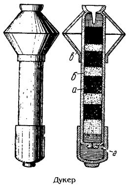 Дукер, называемый иначе водяным фонтаном, представляет фигуру, сжигаемую на воде. Дукер плавает и выбрасывает вверх блестящие искры наподобие фонтана, причем по временам погружается целиком в воду, а в конце горения разрывается с громким выстрелом. Дукер устроен так же, как и фонтан, с той только разницей, что между составом его а помещаются в нескольких местах небольшие пороховые заряды б, а сверху гильзы прикрепляется полый поплавок в. Для придания дукеру вертикального положения на воде к нижней части его прикрепляется груз г. Фигуры эти при фейерверках сжигаются иногда отдельно, причем их зажигают в руках и бросают в воду. Иногда же ими наполняют особого рода фугасы, представляющие собой макеты больших морских животных, например китов, дельфинов и т. п.