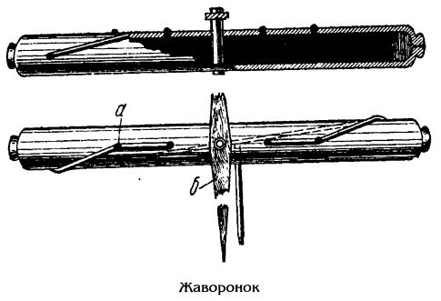 Жаворонок, называемый иначе вихрем или турбилионом, представляет собой фигуру, которая при горении быстро вращается вокруг своей оси и в то же время поднимается вверх, создавая вихрь из блестящих искр. Полет этой фигуры напоминает полет жаворонка. По устройству своему фигура эта подобна китайскому колесу и отличается от него только тем, что кроме крайних вращательных отверстий имеет еще на каждой половине по нескольку отверстий, расположенных в перпендикулярном к крайним отверстиям направлении и называемых подъемными а, потому что газы, образующиеся при горении состава, выходя через эти отверстия, поднимают жаворонок вверх. Для придания этой фигуре правильного полета присоединяют к ней так называемое крылышко б, которое выделывается из тонкой лучины и прикрепляется к жаворонку со стороны подъемных отверстий, перпендикулярно к оси гильзы.