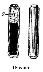 По устройству пчелка похожа на китайское колесо, но гильза ее имеет сбоку только одно отверстие, а в противоположном конце содержит небольшой заряд пороха а, который по окончании горения производит звук, похожий на выстрел. Среднего отверстия для железного стержня пчелка не имеет, так как самостоятельно в фейерверках она не употребляется, а служит, как и швермер, для снаряжения ракет, бураков, фугасов и пр.